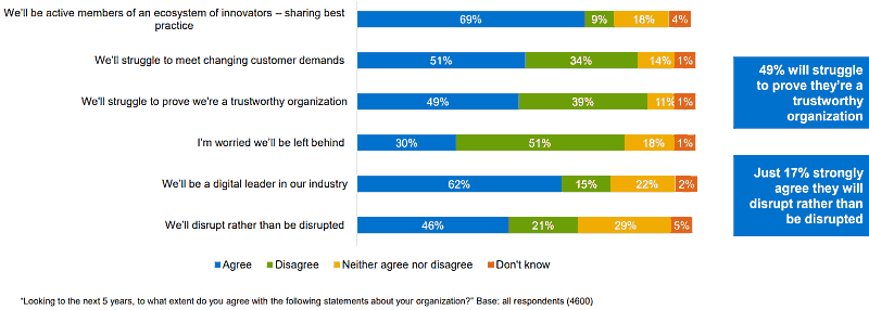 In den meisten Firmen weltweit beherrscht die Angst vor der Digitalisierung jede Handlung. So geben 91% der 4.600 Entscheider von Unternehmen aus 42 Ländern und 12 Industriezweigen in der Dell-Studie an, dass sie sich in Bezug auf die Digitalisierung großen Hürden gegenübersehen. 51% haben Sorge, den Kundenbedarf in den kommenden fünf Jahren nicht erfüllen zu können und 49% denken, dass ihre Glaubwürdigkeit bei den Kunden leiden wird. 32% der Befragten glauben nicht, dass ihr Betrieb die Vorgaben des Gesetzgebers zur Digitalisierung (Stichwort: DSGVO) einhält und ein Drittel der Befragten fürchtet, dass die verwendeten kundendaten nicht ausreichend geschützt sind.